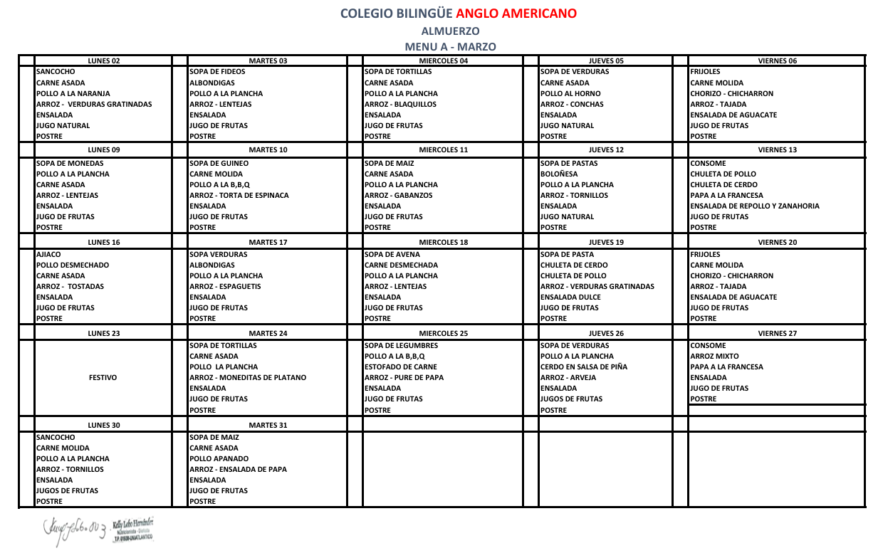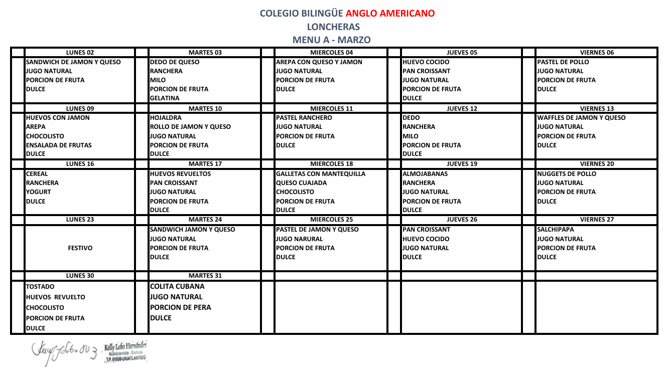 El Menú de nuestro colegio está avalado por dietista profesional y garantiza un adecuado balance nutricional para nuestros estudiantes. Manejamos 2 tipos de menú para todo al año lectivo, los cuales se intercalan de la siguiente manera: